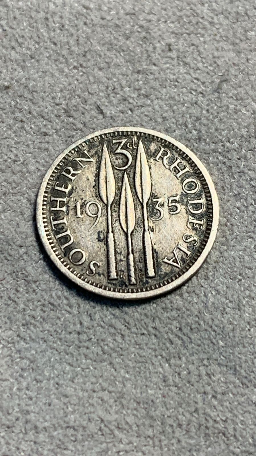 Southern Rhodesia 1935 3d in silver.  See photos for details and condition.