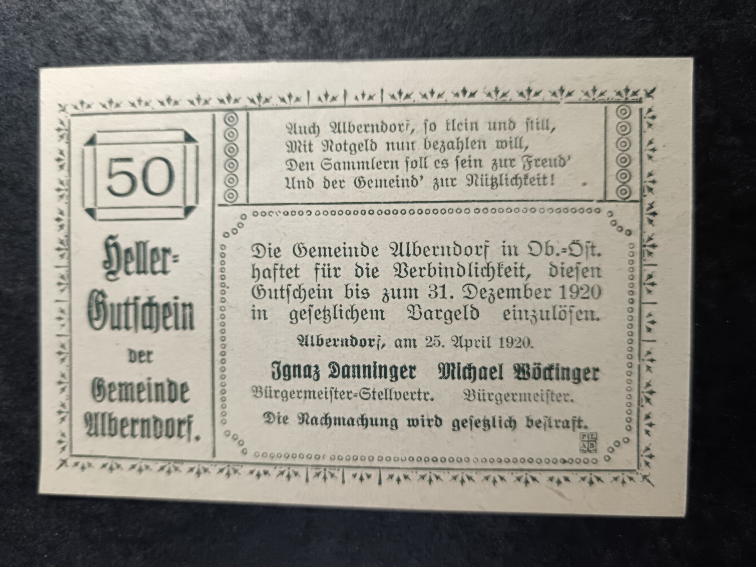 50 Heller Notgeld Alberndorf. See photos for details and condition