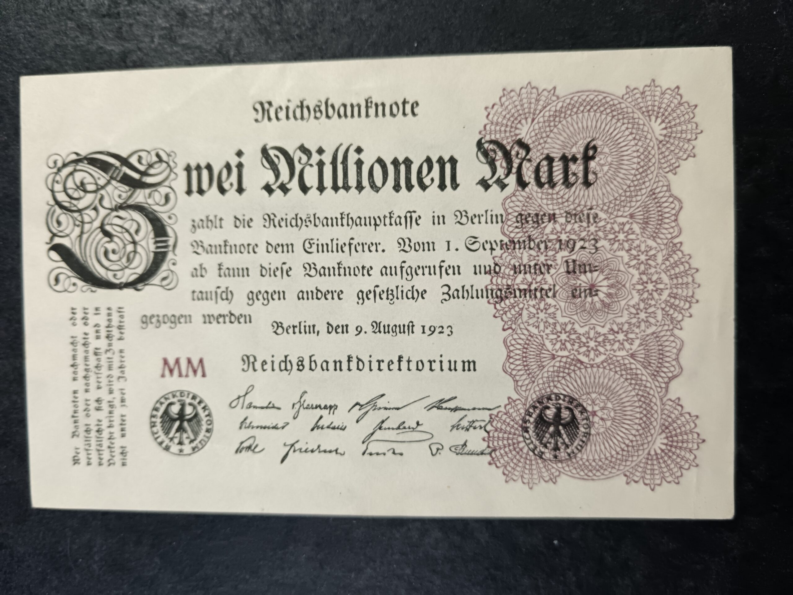 German Reich banknote. Zwei Million Mark. Berlin 9 August 1923. See photos for details and condition