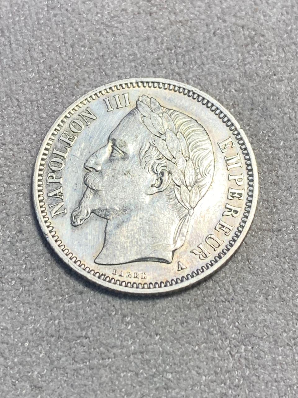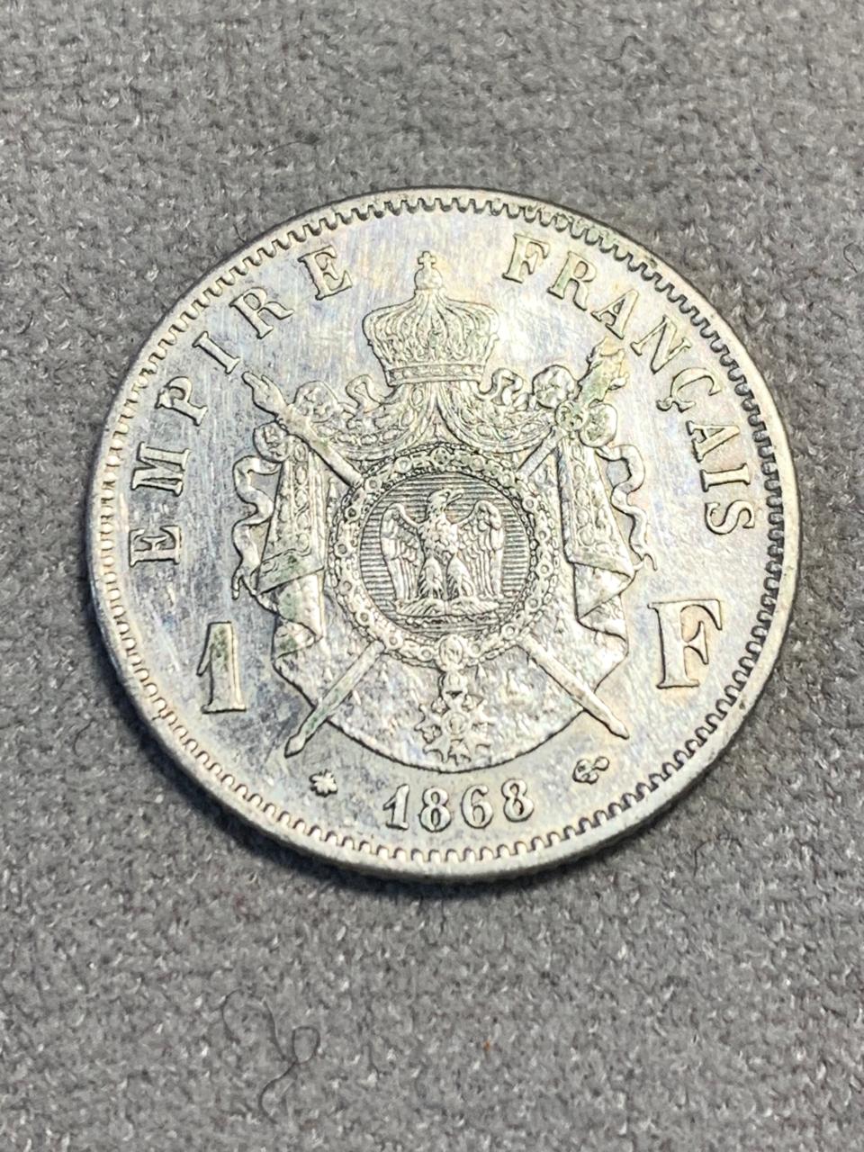France 1868 1 Franc. Napoleon III. This is the A variant with a XF catalogue value of R700. Silver. See photos for details and condition.